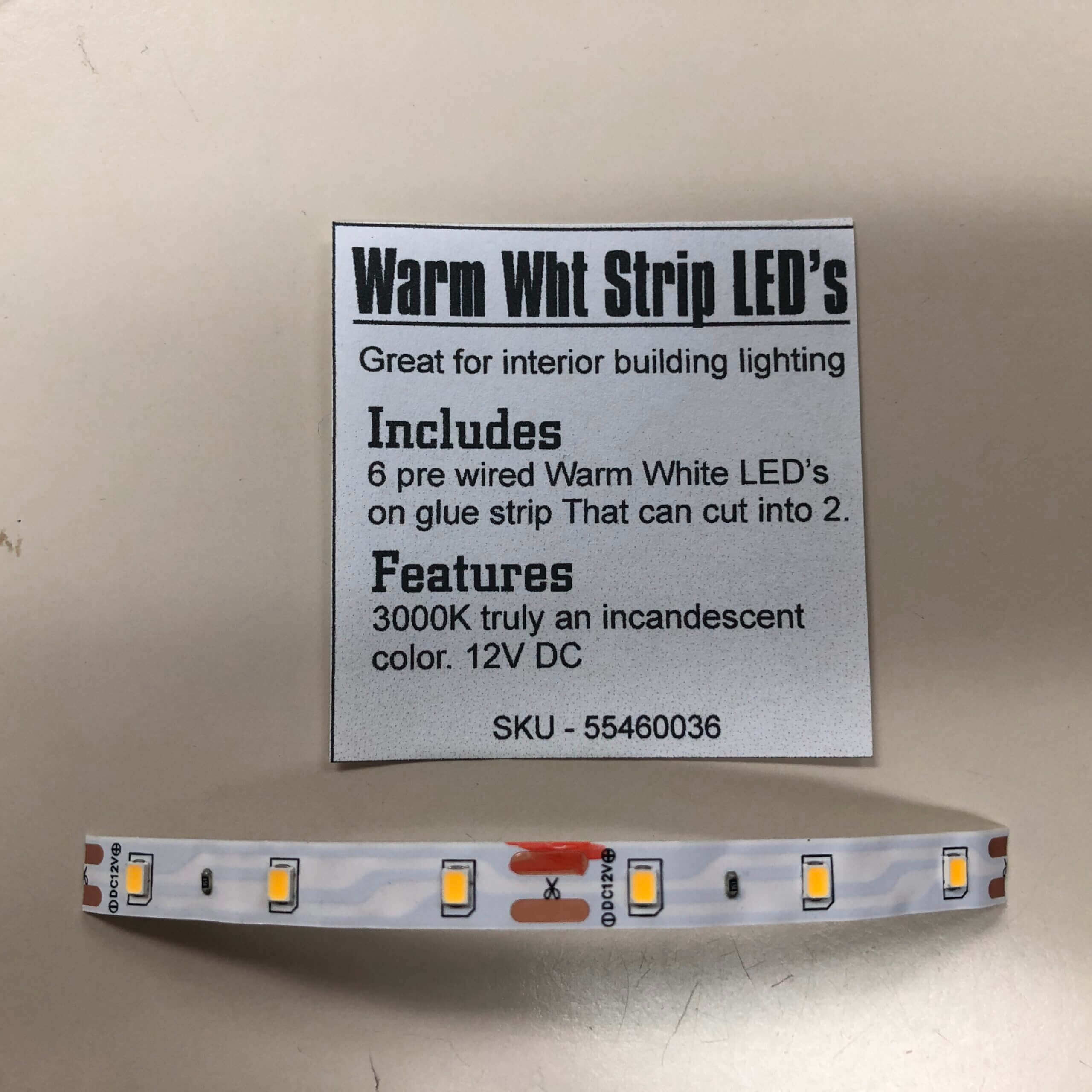 Warm Whit Strip LED’s are great for interior lighting. or building down lighting. There are 6 pre wired LED that can be cut into two 3 LED strips. 12 Volt DC per strip. 3000K truly an incandescent old time color fill.